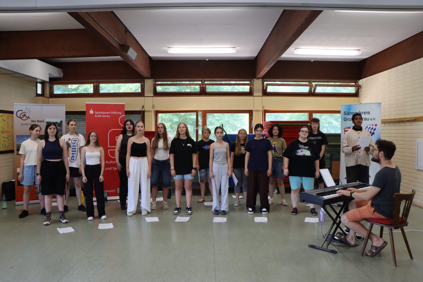 KREIS GROSS-GERAU – Mit einem beschwingten Abschlusskonzert endete am Freitag, 15. August, die erste Jugend-Singwoche im Kreis Groß-Gerau. Trotz hochsommerlicher Temperaturen präsentierte der gemischte Projektchor im Sportlerheim der SKV Mörfelden ein kurzes Konzert vor rund 50 Angehörigen und Freunden.